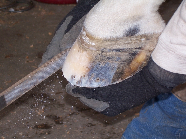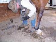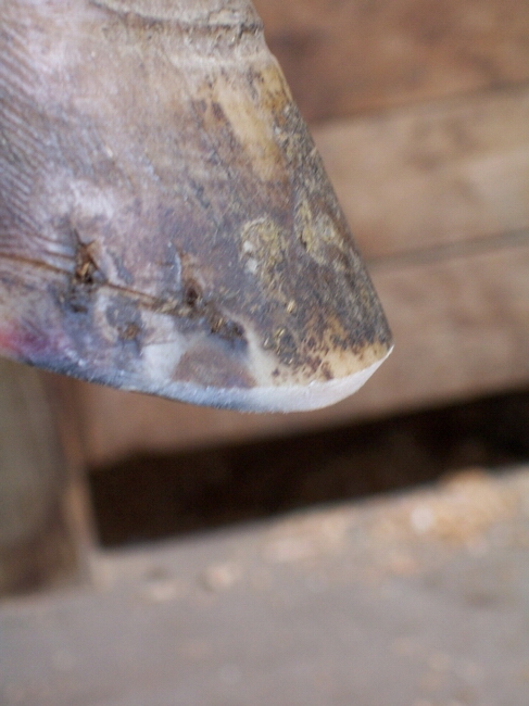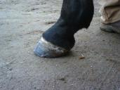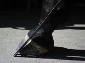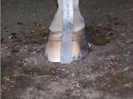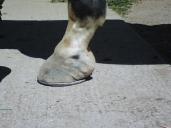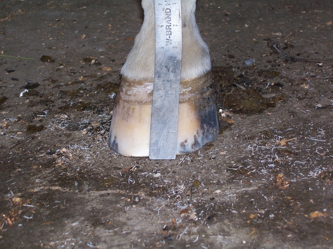 Acapulco's hoof capsules were severely distorted with extremely long toes and under run heels. His shoes sat forward on his feet 1.5 inches in front of the bulb of his heels. The stress from having his toes so forward had caused the lamina to separate in both front feet. We began by pulling the shoes and giving Acapulco a very aggressive series of trims using a natural farriery technique called "beveling" to bring the toe length back. We set each series of shoes back to the edge of the bevel, sometimes 1/2 inch behind his actual toes! Very conscientious farrier work that brought his hoof angles from 43 degrees to 55 degrees in just 3 shoeings.