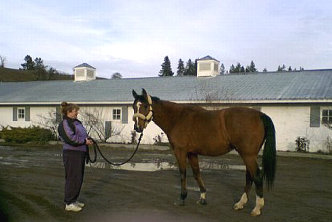 Acapulco is a 1989 Westfalen gelding imported from Germany. He has had a long career as a hunter and a jumper, ending his career as a young rider's equitation horse on the indoor circuit. He was competed heavily in the 4' division. When his rider went to college, Acapulco was sent from his home in Colorado to a well respected sale barn in the east. During a vet exam, a nerve block was done that resulted in a staph infection developing in his right front foot. As a result of the infection going untreated, Acapulco developed "iatrogenic laminitis" that resulted in a 15 degree rotation in his right coffin bone. In addition, he had a severely gaping quarter crack on the lateral side of his left front foot. Acapulco was given to Michelle because he was not sound for light riding or jumping as a lesson horse. Acapulco's program, like all the rehab horses, has included chiropractic care, acupuncture, and massage. He was also on pharmaceutical drugs when he came off the truck. We immediately discontinued the drugs and starting detoxing him. He has received no bute, no Isox, no drugs of any kind during his rehabilitation.