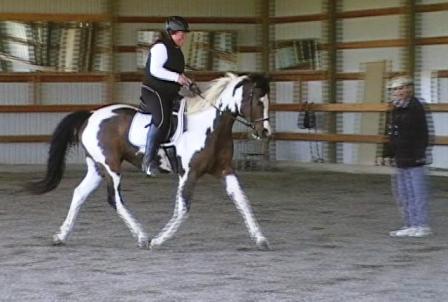 Secret is the most recent horse to come in for rehabilitation. This lovely 1996 American Warmblood is a grandson of the Dutch Warmblood Art Deco on the top and Secretariat on the bottom. Beautifully bred, beautifully built, beautifully colored, he was a beautiful mover as a young horse. Secret was trained and shown through Second Level in dressage. He was put into the modern "rollkur" form and ridden with oversped haunches and neck rolled up with his chin to his chest. During the course of that training, Secret developed a mysterious lameness that was eventually diagnosed as navicular disease. Even though he did not show typical navicular syndrome symptoms, ex-rays showed minor navicular changes in one front foot. It was determined that he should be destroyed at the young age of 11. To their credit, his owners did not want to do that, so Secret was given to Relational Riding Academy in the hope that he might have a useful life.
